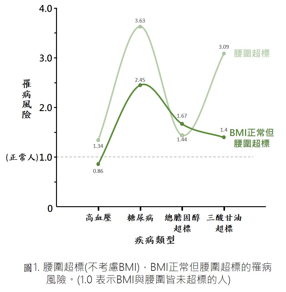 調查發現與正常人(無腹部肥胖且BMI正常)者相比,光是腰圍超標(不考慮BMI與否) 罹患高血壓的風險就會增加34%、罹患糖尿病的風險增加263%、總膽固醇升高的風險增加44%及三酸甘油升高的風險增加209% (圖1)。